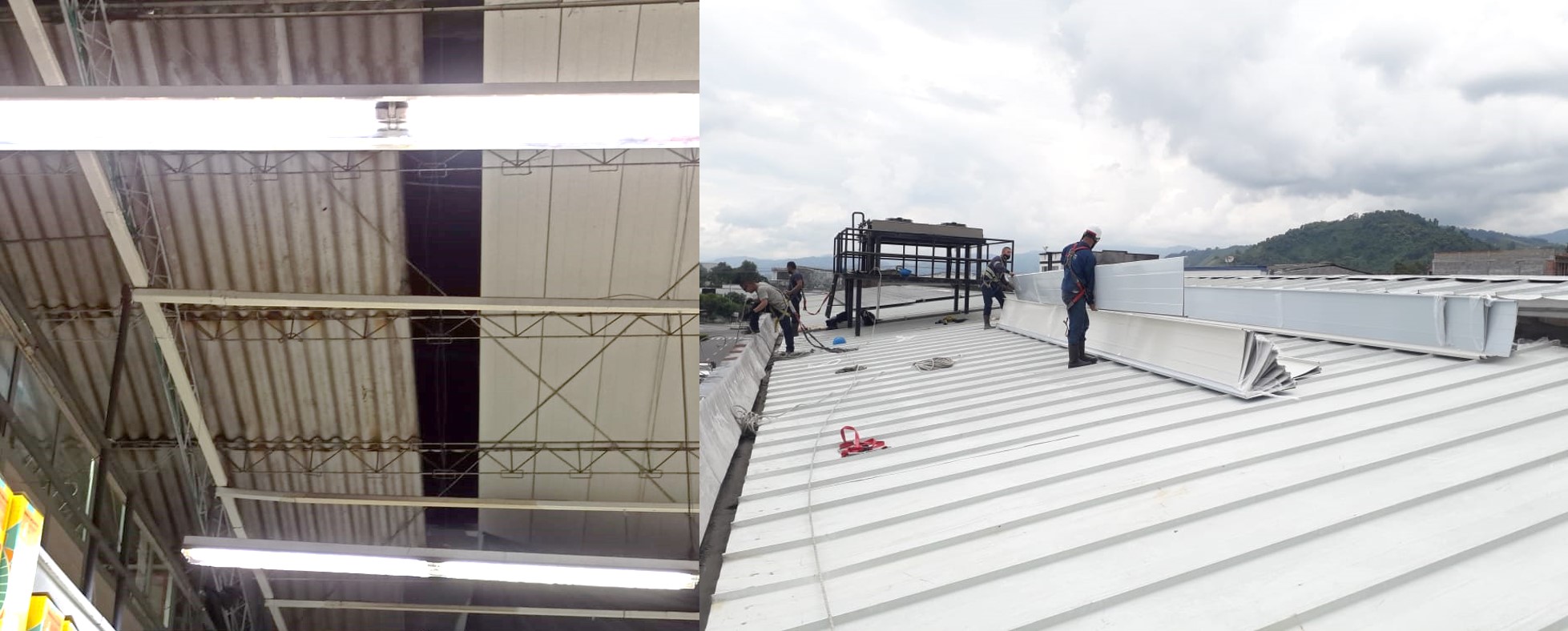 Cambiamos cubiertas para mejorar temas de obsolescencia de cubiertas con filtraciones recurrentes difíciles de reparar, también para mejorar el control de temperatura mediante aislamiento térmico y reducir cargas solares mejorando el confort térmico y/o los costos de refrigeración o calefacción, mejoramiento de iluminación y presentación de las zonas internas y reducción de peso sobre la estructura, de acuerdo con especificaciones en línea con las necesidades del cliente. Contamos con un equipo de diseñadores y personal de planeación para ofrecer la menor cantidad de tiempo muerto en los horarios adecuado a nuestros clientes. Contamos con trabajadores certificados en trabajos en altura de acuerdo con la legislación colombiana.